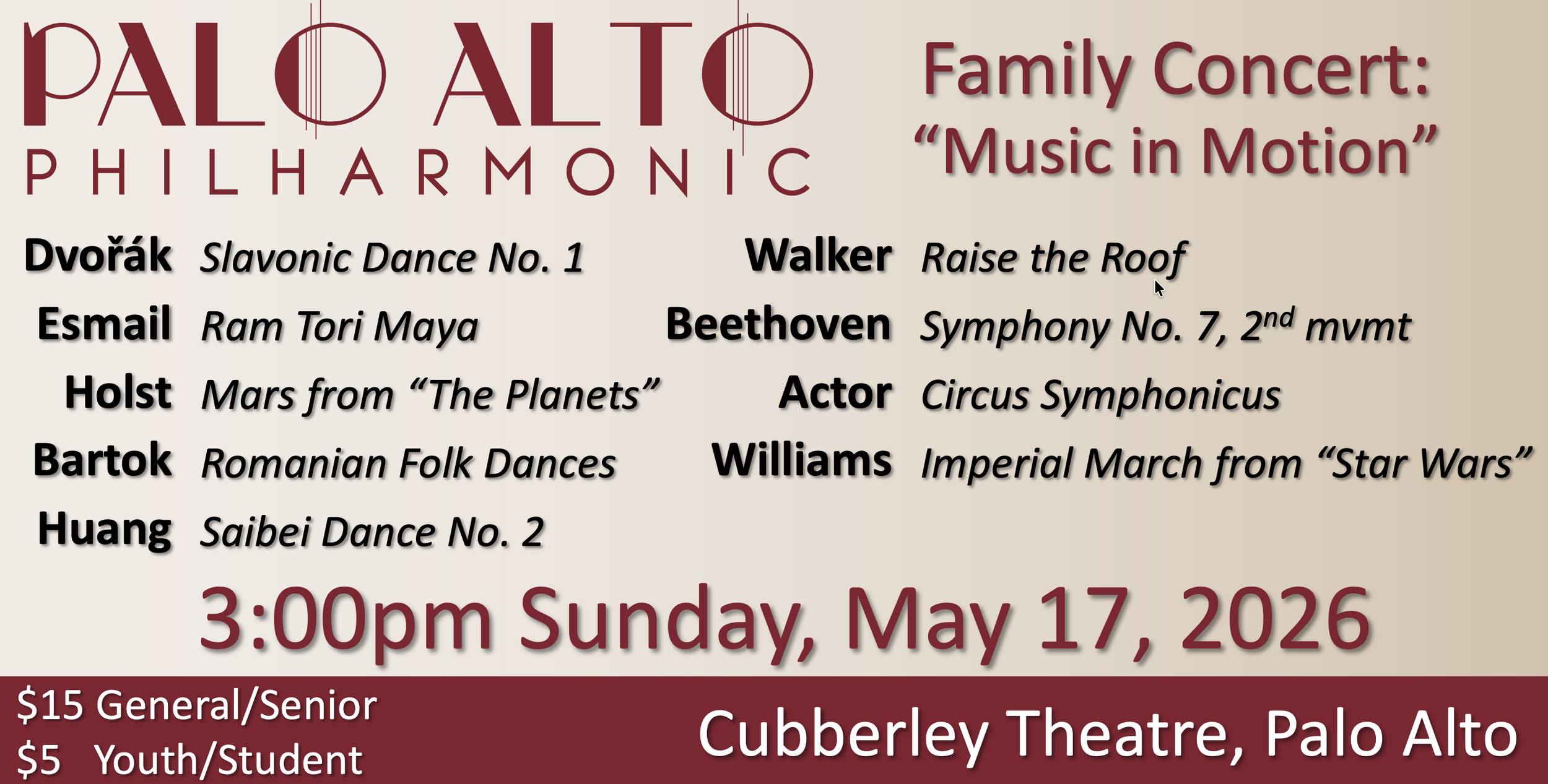 The Palo Alto Philharmonic Association is a registered non-profit organization, governed by an all-volunteer Board of Directors. In addition to presenting musically stimulating concerts at reasonable prices and in venues convenient to many, the Philharmonic is dedicated to encouraging all — young and old — to perform and appreciate serious contemporary and classical music. Our members as well as our audience, come from all over the Bay Area to make and enjoy music together.